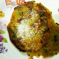 7. Heat the pot, then pour a little clear oil.After it is hot, dip your hands in water, pinch a piece of pumpkin puree, pat it into a cake, put it in the pot, and fry on both sides until it is slightly mushy.Take out of the pan and sprinkle with sugar.