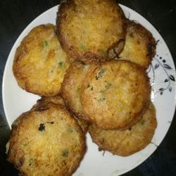 8. Then use a spoon to scoop out the mashed potatoes.Shape into cake shape with hands.Then coat it in egg wash and put it in the pan when it is 60% hot.Use a spatula to press it halfway.The cake should not be too thick so that the lean meat can be cooked thoroughly.Wait until both sides of the potato pancakes are fried until golden brown.
