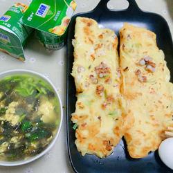 5.The final picture of the finished product! Dinner, shrimp skin, seaweed and egg soup + seafood pancake