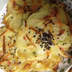 1. Add an egg to the flour and add an appropriate amount of water Mix into a batter, peel and shred the potatoes, shred the intestines, carrots and green peppers, add them to the batter, add chopped green onion, then add an appropriate amount of salt, mix well and set aside