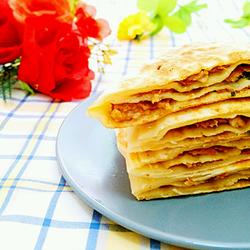 12. Spread the meat filling evenly on 3/4 of the dough sheet, leaving 1/4 blank, leaving 1 finger of blank space on the side, use a knife to cut a horizontal cut in the blank space.