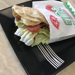 7.Put the tomatoes, lettuce, ham and sausage on the pancake and fold it in half