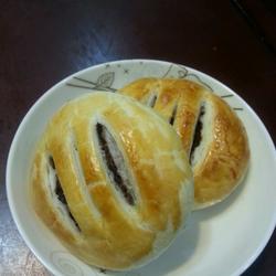 5. Press both sides into the middle, roll it out into a dumpling wrapper shape and wrap the red bean filling.Cut three times with a knife, brush with egg wash and sprinkle with some sesame seeds for decoration.
