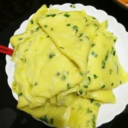 3. Pour a small spoonful of oil into the pan, heat it slightly, pour in a spoonful of egg and leek paste, pick up the pan and let it spread evenly , fry for a while, the color turns yellow and solidifies, and it is ready to serve