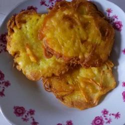 6. Use a spoon to pour the batter Fry in hot oil until both sides are golden