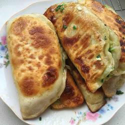 • Illustration of how to make chives and seafood pancakes 77.Put the stuffing on half of the dough and then close the other half and wrap it tightly