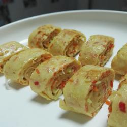3.Crack the eggs into a large bowl, add three tablespoons of flour, appropriate amount of water, appropriate amount Salt, stir well and add all ingredients.Stir, not too thick, just like porridge.Heat a pan, add oil, pour a spoonful of batter, spread evenly, not too thick, when the egg liquid on the surface is about to solidify, start rolling the egg cake from one end, put the rolled egg cake on one end of the pan, continue to add the egg liquid, the same method, press the first egg on the second egg pancake and continue rolling.After rolling it up, roll it in the pan several times to allow the egg liquid to completely solidify.