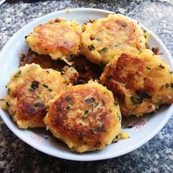 3.Put an appropriate amount of oil into the pan, heat the oil and knead the mixed mashed potatoes into a small ball with your hands, then put it into the pan and fry until done