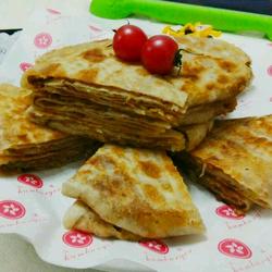 7.Put the meat filling, spread evenly, cut in half up and down with a knife, leaving one third in the middle Not cut.