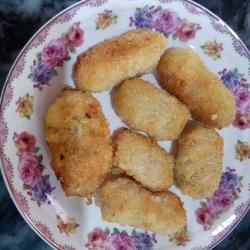 5. Shape the mixed ingredients into a cake shape, first coat in flour, then in egg liquid, then in bread crumbs, and then fry , you're done