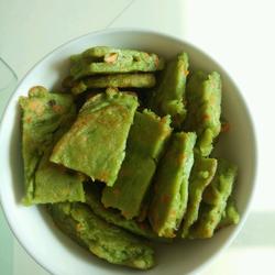 6. Preheat the frying pan, add an appropriate amount of peanut oil to the heat, and pour in an appropriate amount of the stirred green flour.When the color of the bottom of the pot turns golden brown, turn it over and heat it until golden brown.Then cut the flatbread into small pieces and put them into a small bowl for your baby to eat! Sweet, delicious and nutritious baby pancakes are ready!