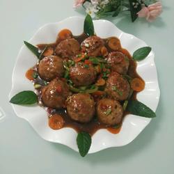 15. Fry the meatballs until golden brown, heat up the pan, pour out the oil, leave oil at the bottom of the pan, add minced garlic, carrot slices, green pepper rings, and red pepper dices and stir-fry Mix well, add a little water, June fresh white soy sauce, a little dark soy sauce, vinegar, sugar, add meatballs, bring to a boil over high heat, cook for a while, add MSG, put the meatballs into a pot, put them in the pot Thinly thicken the gravy with the blanching sauce, then pour it over the meatballs and that’s it!