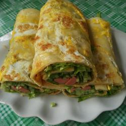 3.Put oil in the electric baking pan.After the oil is hot, spread the mixed flour on In the pan, use a wooden spatula to scrape into thin pancakes and cover with a lid.