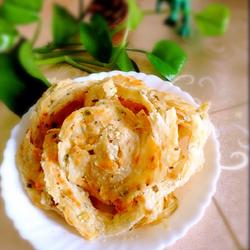 3. Roll the dough into a thin large piece, spread the pastry evenly on the roll.Spread a thin layer on the cake, spread evenly and sprinkle with chopped green onion and a little salt!