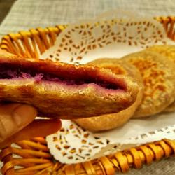 8.Take one and flatten it with your hands, arrange it into a round shape, and pinch it thin The edges can also be manipulated with a rolling pin, just like bun wrappers.Put an appropriate amount of purple sweet potato filling in the center.