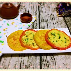 9. If the bell pepper rings are not enough, the extra batter can be mixed with the pancakes.I mixed it.Fry two flatbreads together.Only four bell pepper rings were used for the final presentation.