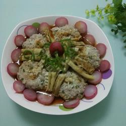 13. Decorate with a small carrot in the middle, sprinkle some MSG, put some June fresh white soy sauce, put water in the pot and bring to a boil , put the pot with the meatloaf in the pot and steam for 12 minutes, turn off the heat, and take it out of the oven after 2 minutes.
