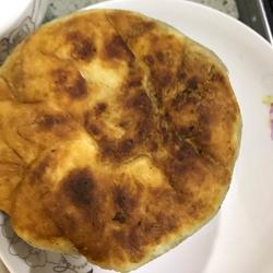 6. Flatten the dough, roll it into a thin pancake skin, and add the meat filling.Use the same technique as making buns, wrap them up, flatten them gently, roll them into a round shape, and prepare them for the frying pan.