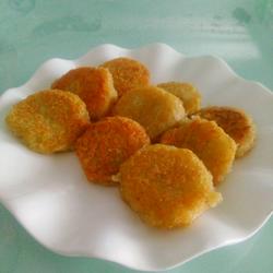 5. Prepare a non-stick pan, put a small amount of oil in the pan, and wear disposables on your hands Use gloves to shape the mashed potatoes into small round cakes, and fry each small round cake in the pan.