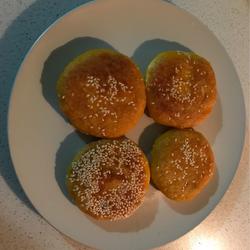 5.Take a small piece, knead it flat, add a piece of bean paste filling, roll it into a ball, and press it flat without using too much force.The pumpkin pie can be thicker, and finally add some white sesame seeds to make it more fragrant