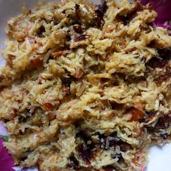 5. Add shredded potatoes to the egg liquid and mix the tomato juice evenly.