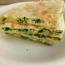 5. Heat an appropriate amount of oil in the pot, put a piece of dough, then put the leeks in, beat the eggs and spread them on top.Cover with another piece of dough
