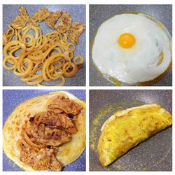 2.In the pot Put a little oil into the pancake and crack the eggs on top.Use chopsticks to break up the eggs and let them heat slowly.When the eggs are almost dry, turn them over
