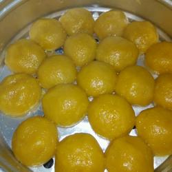 Boil the water, put in the cut pumpkin pieces and cook until cooked, scoop out the pumpkin, mash the scooped pumpkin into a puree, add an appropriate amount of sugar and a little salt, the pumpkin itself is sweet, add glutinous rice flour and cornstarch, Wear gloves and knead it until it is even.After forming a ball, take out an appropriate amount, add some oil and roll it into a small round on your hands.Put it in a steamer and steam it for about 15 minutes before eating!
