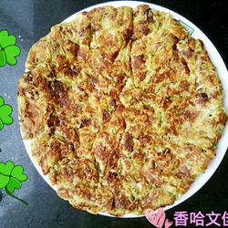 6.After stirring evenly, put the pan on high heat, add oil, a little less oil, and make a cake.The cake is relatively oily.When the oil is 80% hot, put the ingredients into the pot and flatten them with a wooden spatula to make them thin.