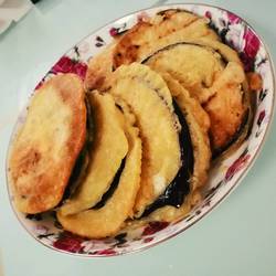 3.A piece of potato and an eggplant overlap each other, Coat it with batter, put it on the electric cake rack, heat the upper and lower plates at the same time, remember to turn it over.