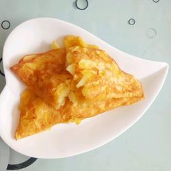 9. When the egg pancake is almost solidified, turn to low heat and put a little apple dices in the middle of the pancake.