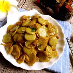 4. Stir-fry until soft and add appropriate amount of water.Add onion and garlic and stir-fry