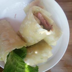 11.Put the spinach juice pancake on the bottom, spread Thousand Island sauce on top of the pancake, then put the roasted spinach, bacon, lettuce, etc., and roll it up