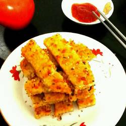 9. Put the rice cakes cut into long strips on a plate, sprinkle with some sesame seeds, and get a plate of tomato sauce to dip it in.It's really sweet and sour Crispy cookies