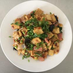 15. Take out the pan, add ham and garlic and stir-fry evenly