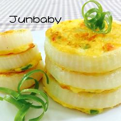 7. Dip the onion rings in a little cornstarch and set aside.Add a little oil in the hot pan and turn off the heat.Add the onion rings and use a spoon to scoop out some mashed potatoes and eggs.Put the paste into the onion rings and smooth them out, then fry slowly over low heat to set