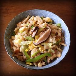 6. Add oil to the pot and add the marinated minced meat.Stir-fry, add the cooked mushrooms, add a little mushroom water and stir-fry until the meat changes color and is cooked.Add the cut pancake strips, add mushroom water and simmer.Add shredded cabbage and stir-fry.Add a little light soy sauce and black pepper according to your own taste.Finally add the scrambled eggs and green pepper, stir-fry again.