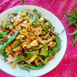 1.The three major ingredients for egg fried pancakes: eggs, pancake shreds, and vegetables.
