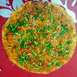 5.Brush Apply a layer of sauce, then sprinkle with a layer of chopped green onions and white sesame seeds.Use a spatula to flip over one corner and turn the bottom of the cake into golden brown.Open while it's hot, the cake bottom is crispy and the sauce is rich in flavor.