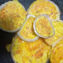 6. Heat the pot and add oil.Add onion rings.Pour the egg mixture into the onion rings and fry over low heat.(When cutting onions, the edges must be cut neatly, otherwise the egg liquid will overflow, as shown below)