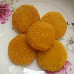7.Make it into a round shape after closing, then roll it in a bowl with bread crumbs and flatten it with your palms
