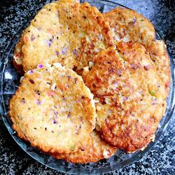 4. Beat the rice, mashed banana, ham cubes, purple cabbage, and eggs, add them to a basin, and add water , starch, flour, pepper powder, sesame seeds, refined salt and mix well