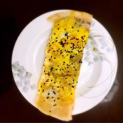2.When one side is fried until golden brown, turn to fry the other side.Then crack an egg on the cake.Stir and spread evenly on the cake.