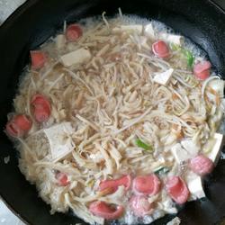 6. Heat oil in the wok, add chopped green onion and cabbage in sequence.Add appropriate amount of water, add intestines and tofu.Bring to a boil over high heat, add shredded biscuits and bean sprouts, stir well, and add appropriate amount of chicken essence.You are now ready to enjoy.