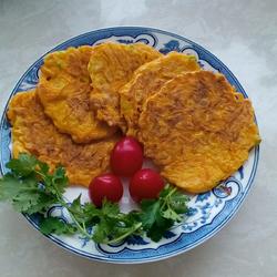 7. When the oil is hot, add the pumpkin shredded paste and use a spoon to shape the paste into a round cake.shape.