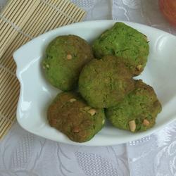 Flour, spinach juice, chopped cooked peanuts ( 200g flour, 80g spinach juice, 80g chopped peanuts ) | Eggs, oil, sugar, baking powder ( One egg, one spoon of baking powder, appropriate amount of oil and sugar ) |