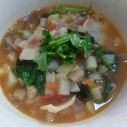 1.Cut tomatoes, potatoes and onions into dices, soak fungus and cut into shreds, cut spinach and set aside