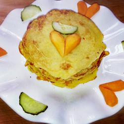 7. Pour a little bit of oil into the hot pan and brush it evenly with a brush.Take a spoonful of the prepared paste and pour it into the pan (a pan is best, put the paste in It will spread naturally after entering) Shake the pot a few times to spread the banana paste evenly.When the banana paste solidifies, use a shovel to shovel the cake and flip it again