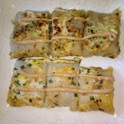 5. Pour in a large spoonful of batter, shake the bottom of the pan to form a cake shape and set it on low heat Fry