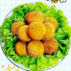 5. Roll the bean paste into a round filling, take the pumpkin pie dough and wrap it with the filling.Press into round cake.Coating it with a layer of bread crumbs will make it taste even better.